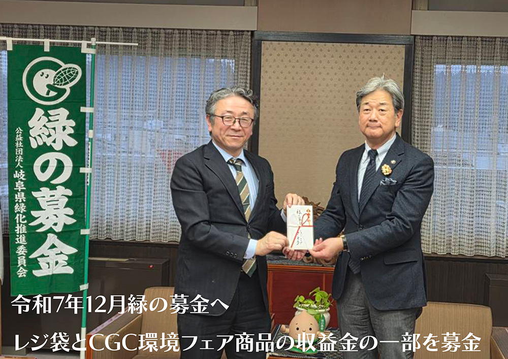 平成20年10月1日からのレジ袋有料化にともない、レジ袋を1枚5円で販売させて頂いております。1年間、さとう4店舗のお客様からお預かりしたこの収益金(販売価格と仕入れ原価の差)と6月開催のCGC環境フェアの対象商品の一部の収益に、さとうの志を添えまして 高山市の「緑の募金」に寄贈させて頂いております。